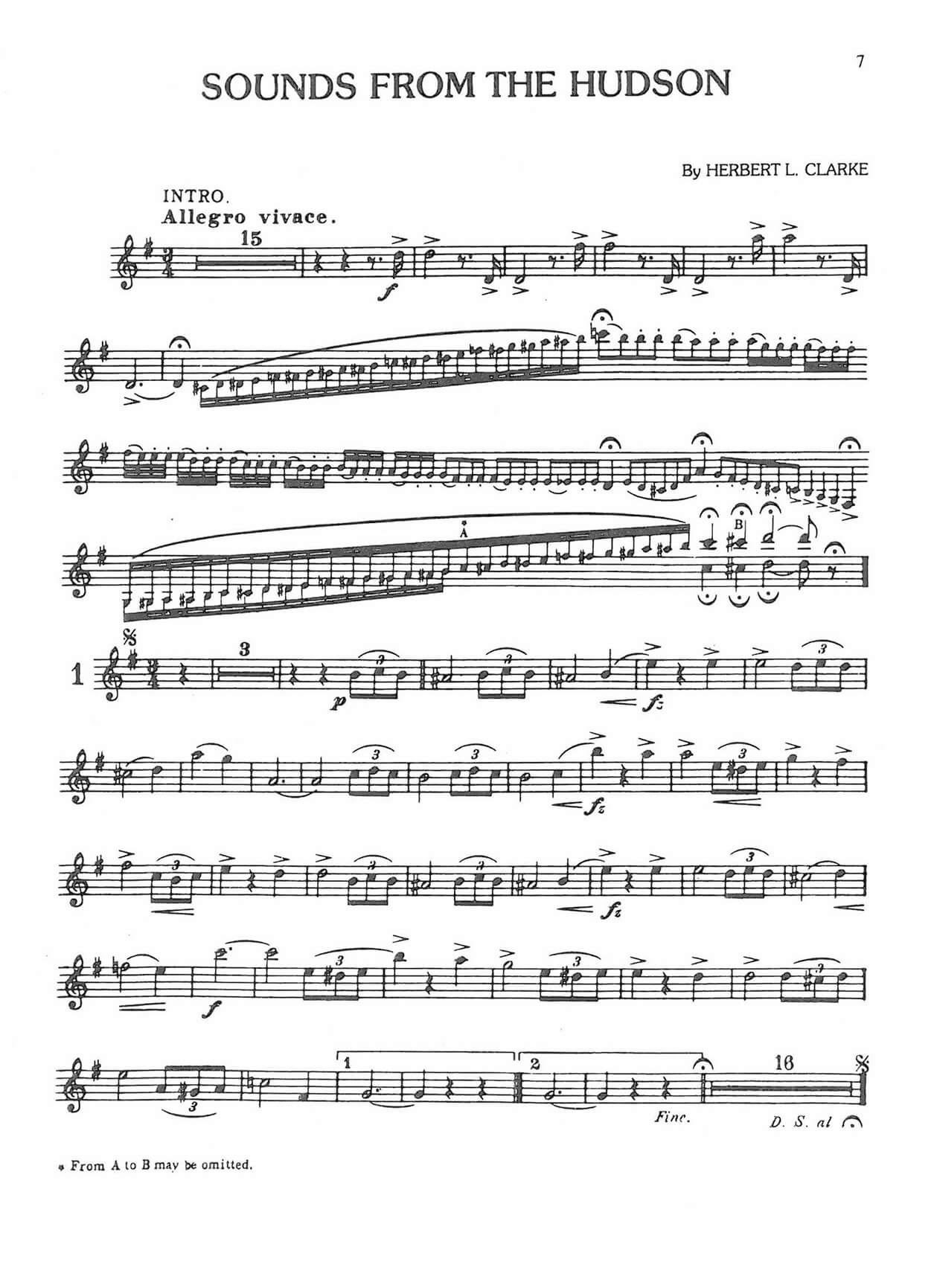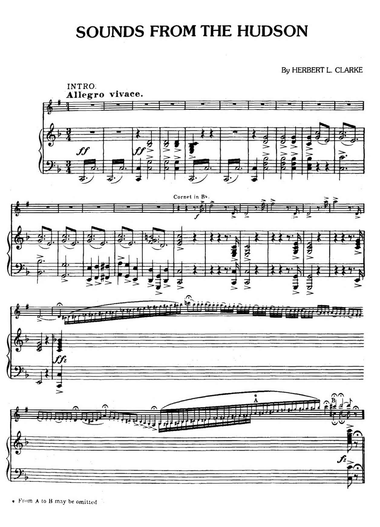 Reminder: Our web site is sells digital music notes that you can download and print immediately after purchase; we do not sell or ship any physical products. All musical and literary materials are provided solely for personal use. Commercial exploitation is prohibited under international copyright law. Works inadvertently included in the library will be promptly removed upon request of the copyright holders.Herbert L. Clarke (1867 –1945) – Sounds from the Hudson – Valse Brillante for trumpet Bb and piano