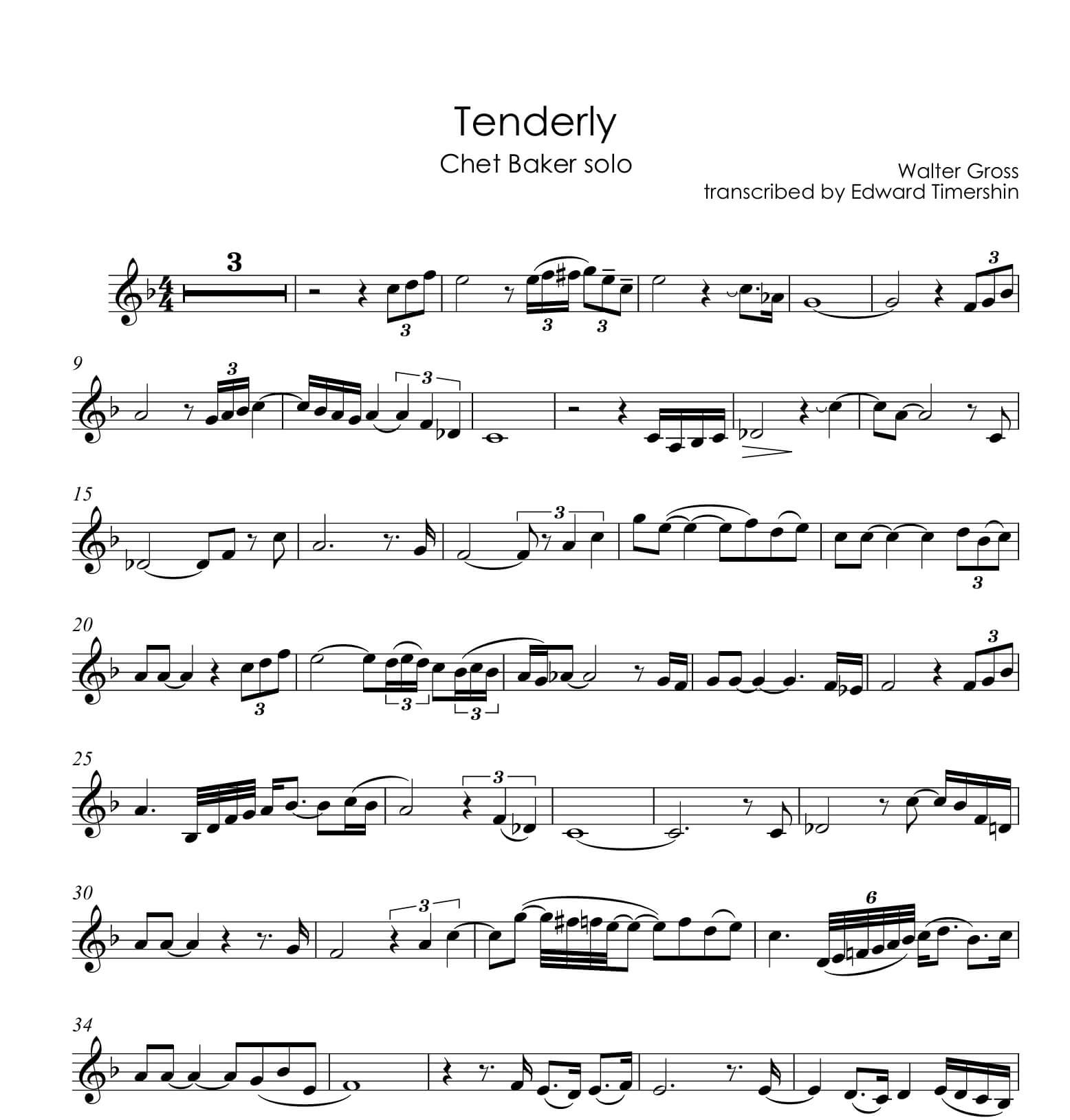 Reminder: Our web site is sells digital music notes that you can download and print immediately after purchase; we do not sell or ship any physical products. All musical and literary materials are provided solely for personal use. Commercial exploitation is prohibited under international copyright law. Works inadvertently included in the library will be promptly removed upon request of the copyright holders.Walter Gross – “Tenderly” Chet Baker’s transcribed trumpet Bb solo