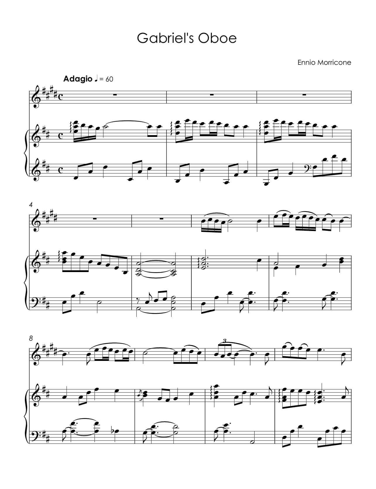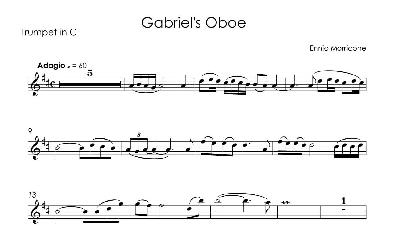 Reminder: Our web site is sells digital music notes that you can download and print immediately after purchase; we do not sell or ship any physical products. All musical and literary materials are provided solely for personal use. Commercial exploitation is prohibited under international copyright law. Works inadvertently included in the library will be promptly removed upon request of the copyright holders.Ennio Morricone – Gabriel’s Oboe for trumpet and piano in D major (original edition)